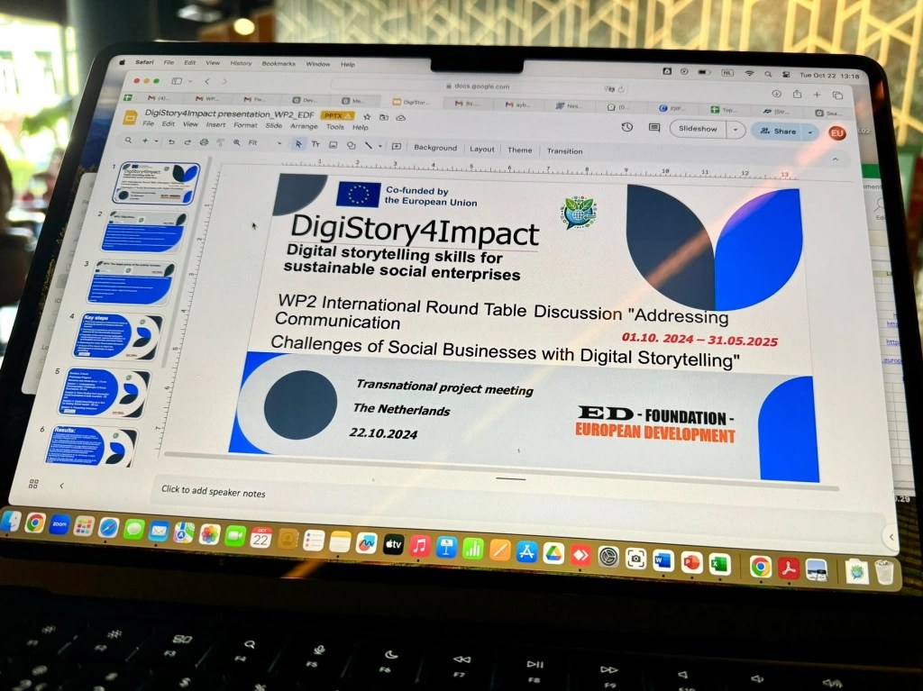 On October 22, 2024, the partners, ATTR (Netherlands), FENAN Consulting (Netherlands) and European Development Foundation (Bulgaria), met in Haarlem (Netherlands), to discuss the the implementation and to plan the first steps in developing Erasums+ project “Digital Storytelling Skills for Sustainable Social Enterprises” (DigiStory4Impact).